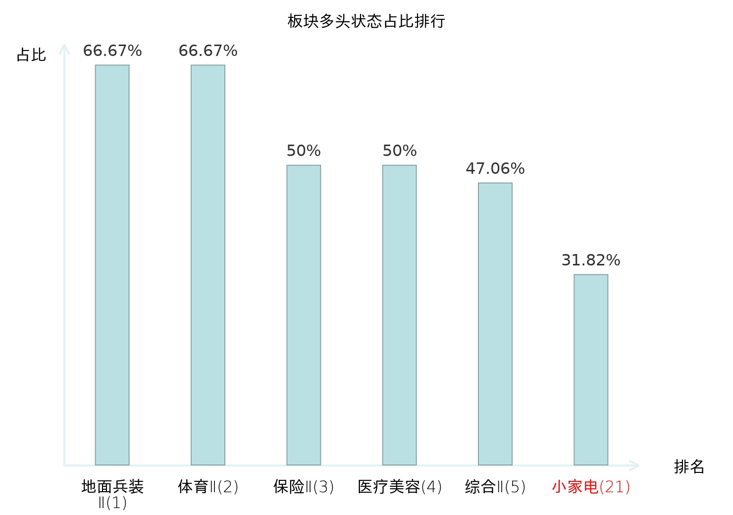 全市场所有行业板块中主力多头状态占比排名中,地面兵装Ⅱ板块位居第一。保险Ⅱ板块名次提升最快,较昨日上升82位。
