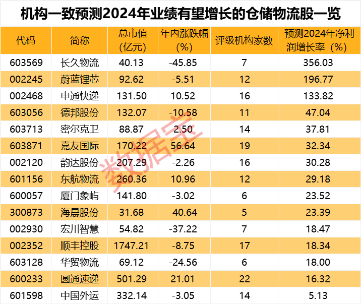 结合机构给予的全年业绩预测数据来看,超5家机构给予评级的16只概念股中,有15只全年业绩有望增长。长久物流、蔚蓝锂芯、申通快递的全年业绩增幅有望超100%。