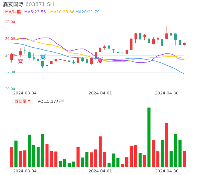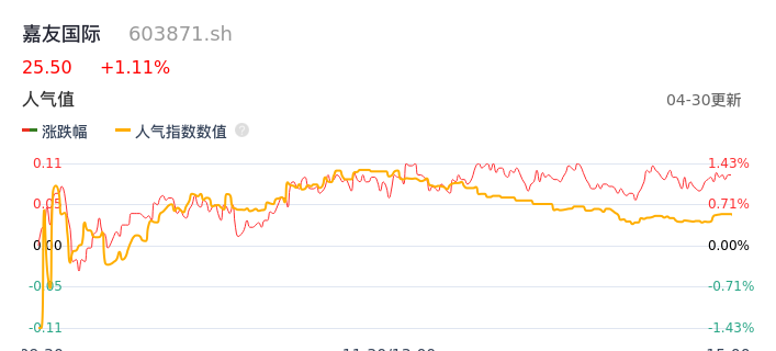 04月30日,嘉友国际收报25.50,股价涨幅1.11%,成交金额1.31亿元,换手率0.74%。