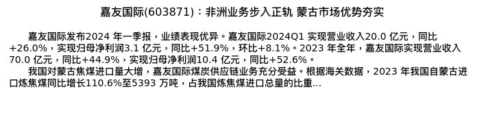 值得注意的是:2024年04月国信证券的高晟/罗丹分析师,首次发布关于嘉友国际的研究报告,标题为:嘉友国际(603871):非洲业务步入正轨 蒙古市场优势夯实。