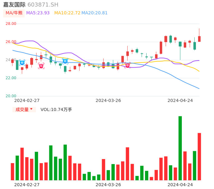 04月24日,嘉友国际收报26.61,股价涨幅5.81%,成交金额2.85亿元,换手率1.54%。