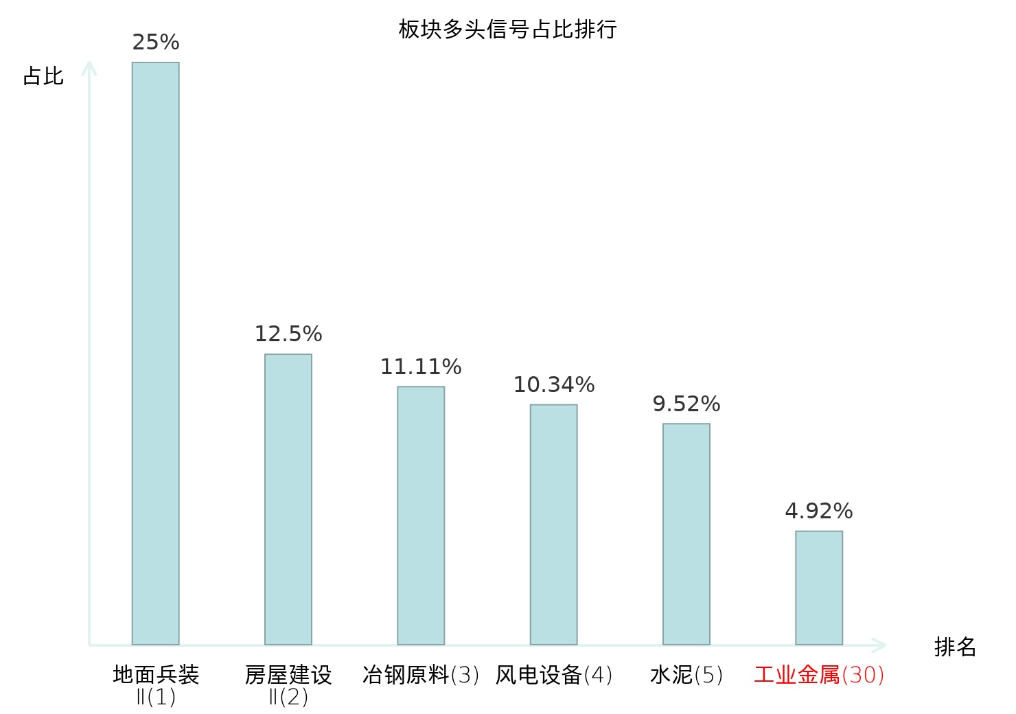 全市场所有行业板块中主力多头信号占比排名中,地面兵装Ⅱ板块位居第一。房屋建设Ⅱ板块名次提升最快,较昨日上升117位。