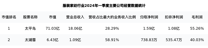 太平鸟最新报告期数据为一季度,下表汇总了服装家纺行业内市值靠前的公司一季度主要经营数据