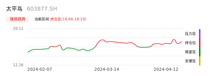 我们来看一下该股的九方特色指标强弱趋势的情况:太平鸟自03月29日从观望区上穿到持仓区。股价近期在多头区域持续强势上扬,上升动能仍较为充足,可积极关注。后续重点关注上方压力位:18.19元是否能突破上攻。