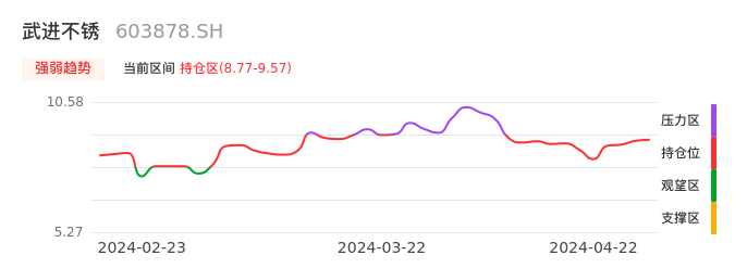 我们来看一下该股的九方特色指标强弱趋势的情况:武进不锈自04月08日从压力区回到持仓区。股价在持仓区盘整一段时间后,目前有启稳迹象。后续重点关注上方压力位:9.57元是否能重新上攻。