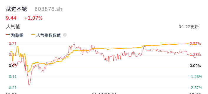 04月22日,武进不锈收报9.44,股价涨幅1.07%,成交金额1.14亿元,换手率2.15%。