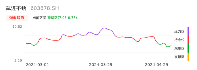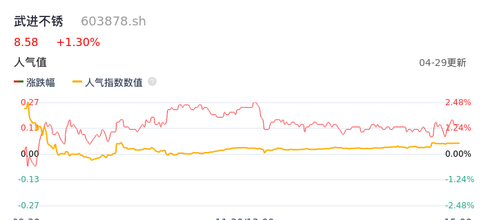 04月29日,武进不锈收报8.58,股价涨幅1.30%,成交金额7539.81万元,换手率1.57%。