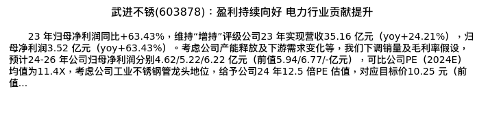 值得注意的是:2024年04月华泰证券的李斌/马晓晨分析师,首次发布关于武进不锈的研究报告,标题为:武进不锈(603878):盈利持续向好 电力行业贡献提升。
