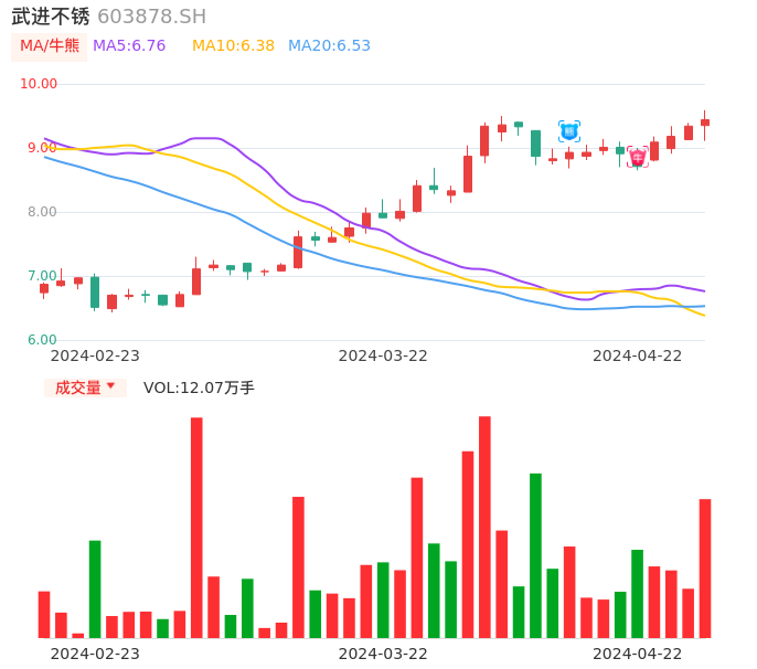 04月22日,武进不锈收报9.44,股价涨幅1.07%,成交金额1.14亿元,换手率2.15%。