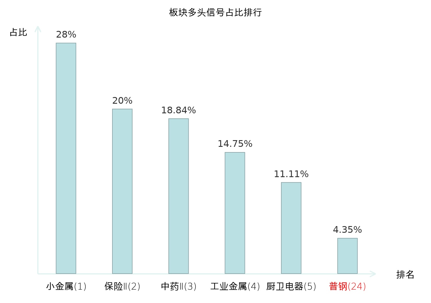 全市场所有行业板块中主力多头信号占比排名中,小金属板块位居第一。保险Ⅱ板块名次提升最快,较昨日上升123位。
