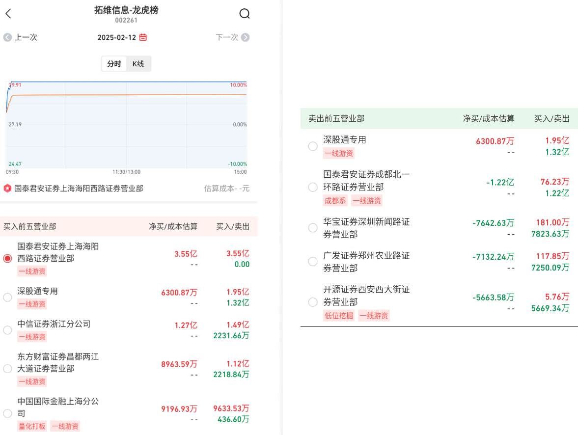 从榜单分析去看,市场整体的估值依旧在抬升,拓维信息代表的昇腾算力概念股来看,市场交易的预期还是deepseek引发的巨大的供需变化情况,这里游资继续大买,海阳西路据说是章盟主的儿子,买一与买三昨日是卖出,今日纠错买回,说明市场情绪这里还是想继续往上去走,因此随着市场情绪的延续这里还是继续往上为主,那就不看空,明日看指数与成交量能否配合往上延续