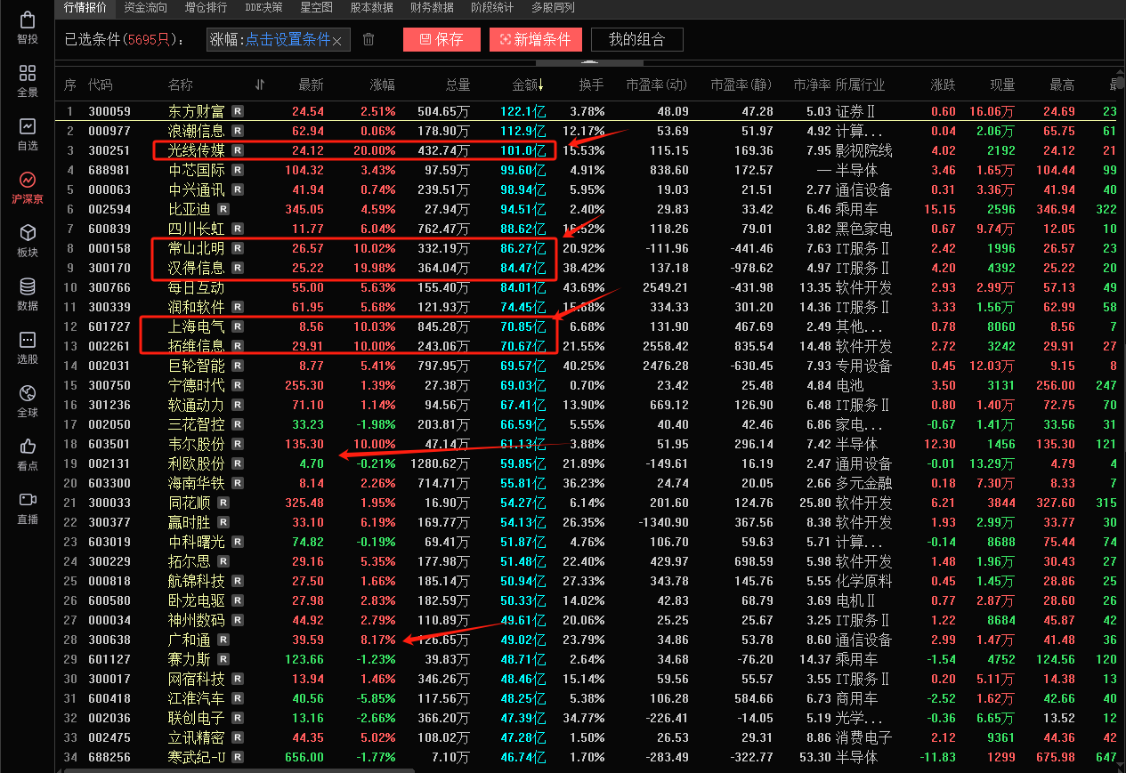 大成交方向上,这里市场还是继续围绕着发酵的方向继续做预期,其中上海电气涨停,拓维信息涨停,大成交正宗的票还是有资金不断地往上延伸,主要还是因为逻辑正且有资金辨识度,那就意味着市场还是认可逻辑的阶段,不少趋势票一直在往上去走,赚钱效应继续发散