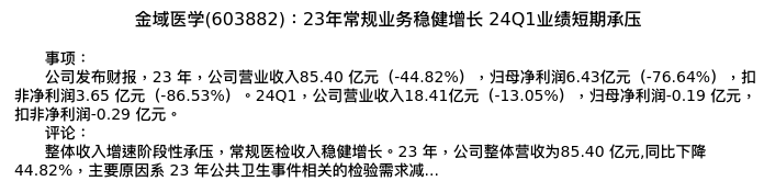 值得注意的是:2024年04月华创证券的郑辰/李婵娟分析师,首次发布关于金域医学的研究报告,标题为:金域医学(603882):23年常规业务稳健增长 24Q1业绩短期承压。