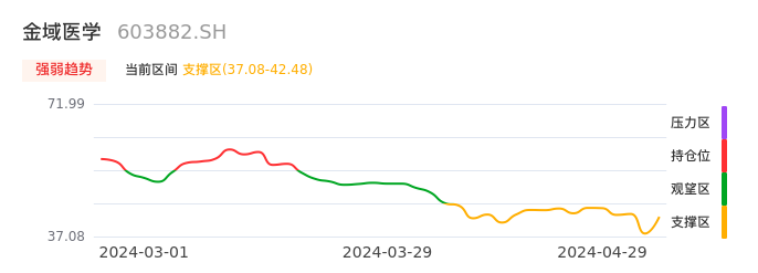 我们来看一下该股的九方特色指标强弱趋势的情况:金域医学自04月09日进入支撑区。股价出现一波快速下跌行情,目前下跌动能有所衰竭。如基本面/消息面未发生重大变化短期可能弱势反弹。注意今日下方支撑位:37.08元,如有效跌破将可能出现新一轮下跌。