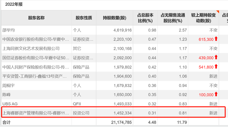 近日,锦和商管发布的2022年年报显示,截至去年底,睿郡资产旗下睿郡11号私募证券投资基金新进该公司前十大流通股东,持股数量为145.2万股。