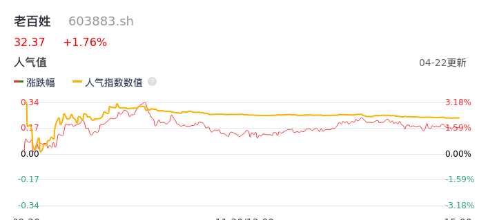 04月22日,老百姓收报32.37,股价涨幅1.76%,成交金额9833.71万元,换手率0.52%。