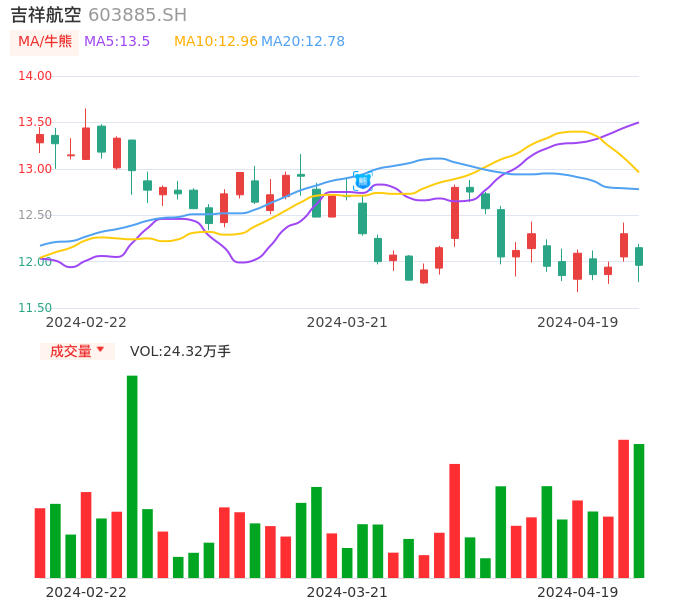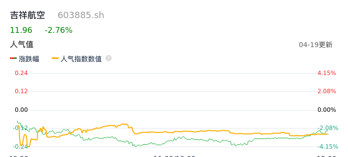 04月19日,吉祥航空收报11.96,股价涨幅-2.76%,成交金额2.90亿元,换手率1.10%。
