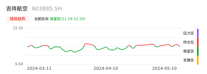 我们来看一下该股的九方特色指标强弱趋势的情况:吉祥航空近日从持仓区下穿到观望区,股价出现持续性调整行情。短期已经转为空头行情,且下跌动能仍未衰竭。建议继续谨慎观望。