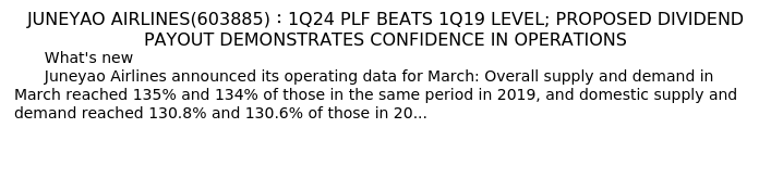 值得注意的是:2024年05月中金公司的Qibin FENG/Xuejian ZHENG/Qikun WU/Xin YANG分析师,首次发布关于吉祥航空的研究报告,标题为:JUNEYAO AIRLINES(603885):1Q24 PLF BEATS 1Q19 LEVEL; PROPOSED DIVIDEND PAYOUT DEMONSTRATES CONFIDENCE IN OPERATIONS。