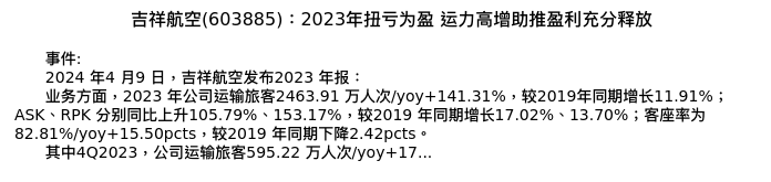 值得注意的是:2024年04月国海证券的祝玉波分析师,首次发布关于吉祥航空的研究报告,标题为:吉祥航空(603885):2023年扭亏为盈 运力高增助推盈利充分释放。