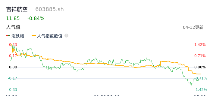 04月12日,吉祥航空收报11.85,股价涨幅-0.84%,成交金额1.61亿元,换手率0.61%。