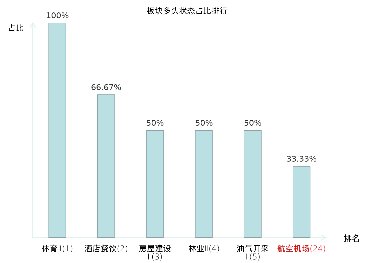 全市场所有行业板块中主力多头状态占比排名中,体育Ⅱ板块位居第一。国有大型银行Ⅱ板块名次提升最快,较昨日上升100位。