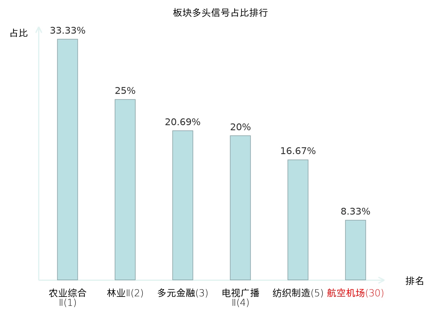 全市场所有行业板块中主力多头信号占比排名中,农业综合Ⅱ板块位居第一。农业综合Ⅱ板块名次提升最快,较昨日上升127位。