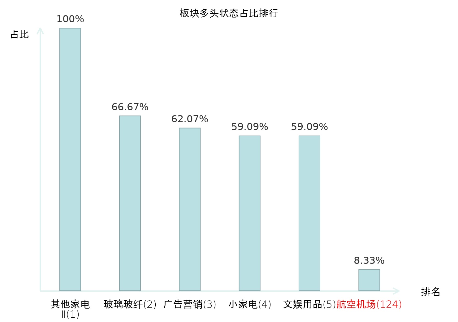 全市场所有行业板块中主力多头状态占比排名中,其他家电Ⅱ板块位居第一。消费电子板块名次提升最快,较昨日上升54位。