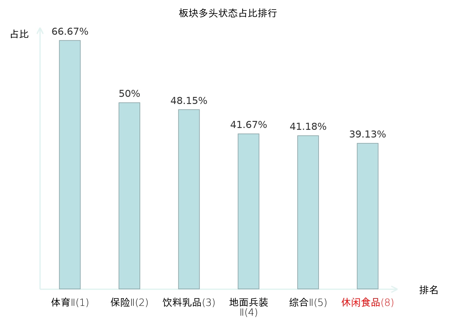 全市场所有行业板块中主力多头状态占比排名中,体育Ⅱ板块位居第一。种植业板块名次提升最快,较昨日上升70位。