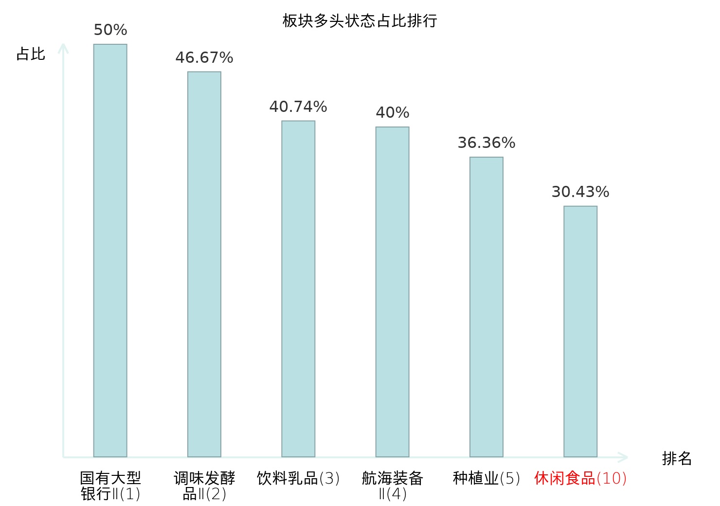 全市场所有行业板块中主力多头状态占比排名中,国有大型银行Ⅱ板块位居第一。金属新材料板块名次提升最快,较昨日上升71位。