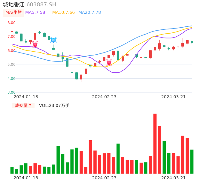 03月21日,城地香江收报6.57,股价涨幅-2.52%,成交金额1.52亿元,换手率5.12%。