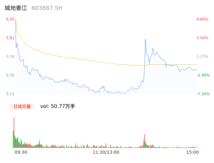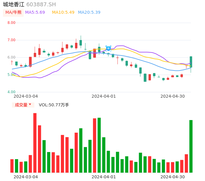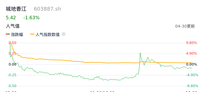 04月30日,城地香江收报5.42,股价涨幅-1.63%,成交金额2.78亿元,换手率11.26%。