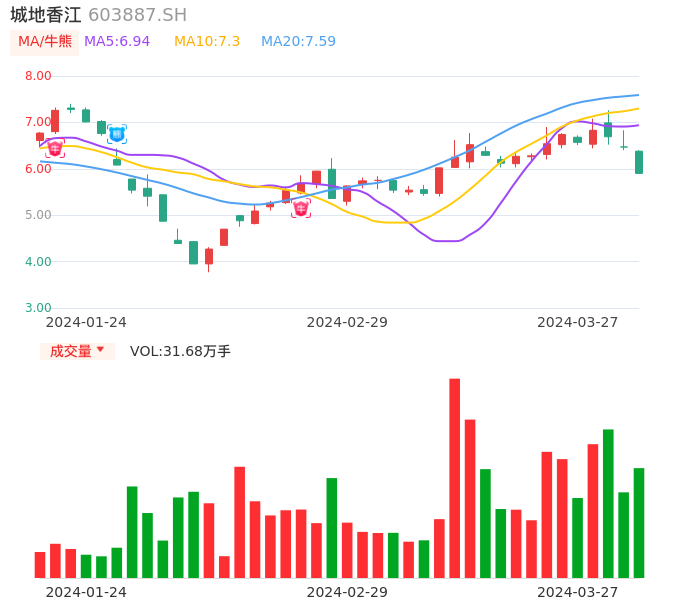 03月27日,城地香江收报5.90,股价涨幅-8.81%,成交金额1.93亿元,换手率7.03%。