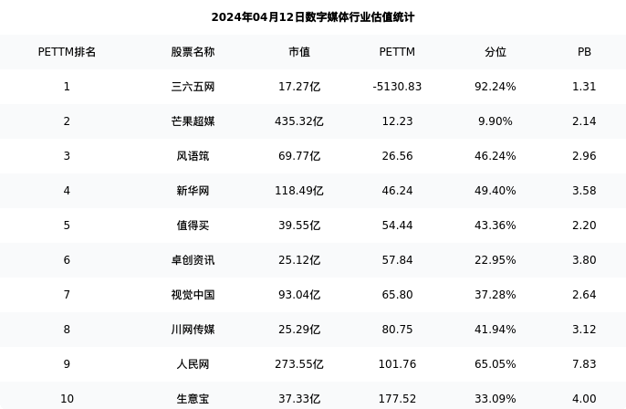 从估值角度看:新华网最新市盈率PETTM为46.24,在行业内排名3/13,处于49.40分位。