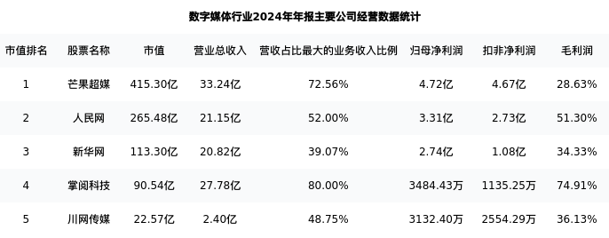 新华网最新报告期数据为年报,下表汇总了数字媒体行业内市值靠前的公司年报主要经营数据