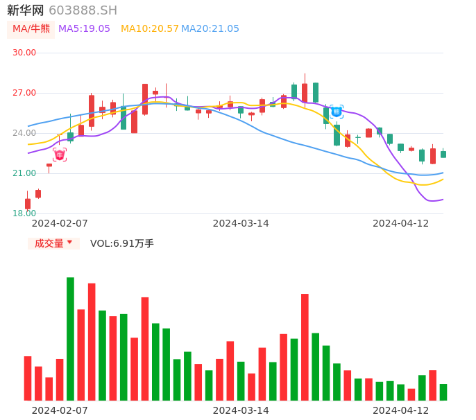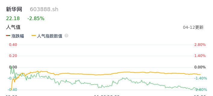 04月12日,新华网收报22.18,股价涨幅-2.85%,成交金额1.55亿元,换手率1.33%。