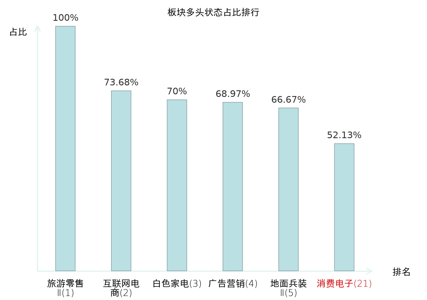 全市场所有行业板块中主力多头状态占比排名中,旅游零售Ⅱ板块位居第一。厨卫电器板块名次提升最快,较昨日上升76位。