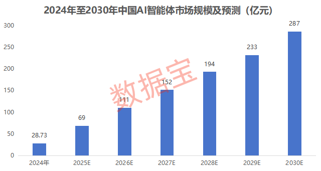根据中商产业研究院的报告,全球AI智能体市场规模迎来爆发式增长,2025年全球AI智能体市场规模将达113亿美元,2030年将接近500亿美元;2025年中国AI智能体市场规模将达69亿元,到2030年将接近300亿元,2025~2030年复合增速有望超过30%。