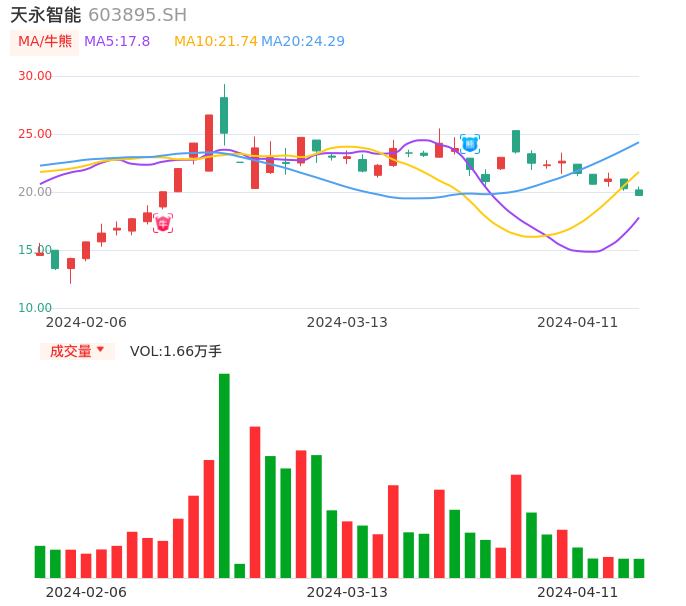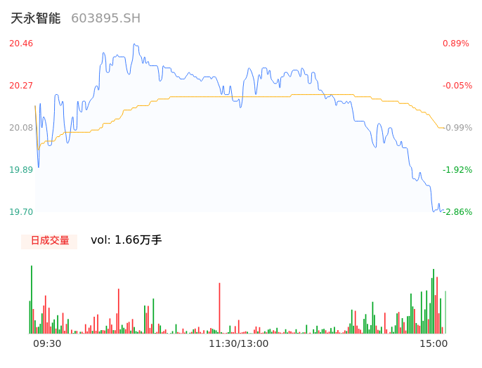 04月11日,天永智能收报19.70,股价涨幅-2.86%,成交金额3334.17万元,换手率1.54%。