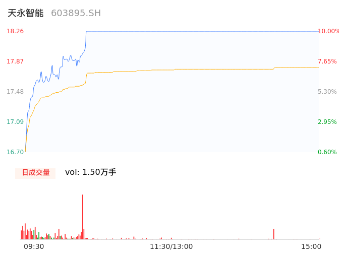 04月17日,天永智能收报18.26,股价涨幅10.00%,成交金额2661.63万元,换手率1.38%。