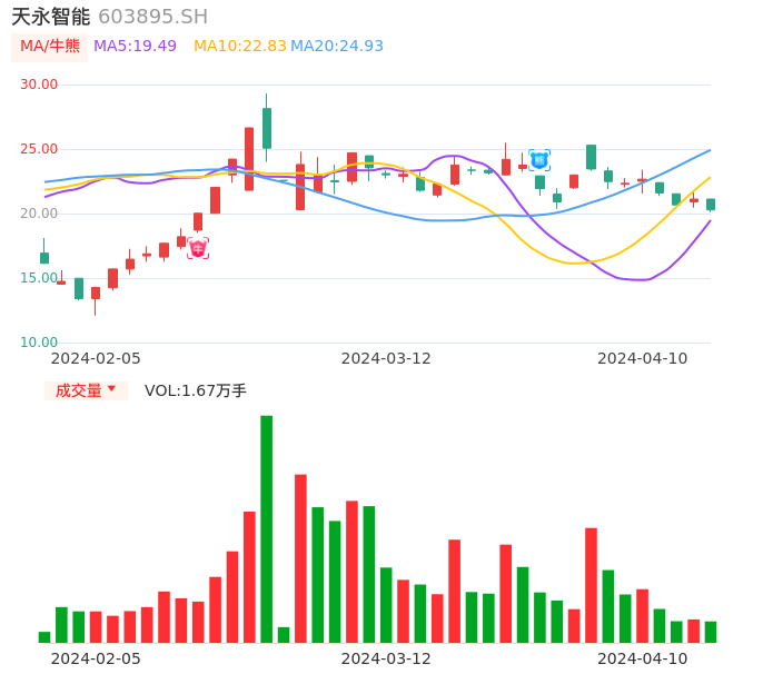 04月10日,天永智能收报20.28,股价涨幅-3.98%,成交金额3418.88万元,换手率1.54%。