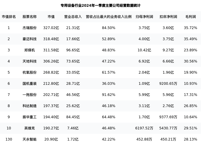 天永智能最新报告期数据为一季度,下表汇总了专用设备行业内市值靠前的公司一季度主要经营数据