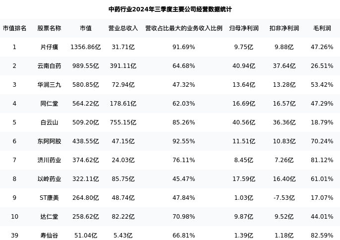 寿仙谷最新报告期数据为三季度,下表汇总了中药行业内市值靠前的公司三季度主要经营数据