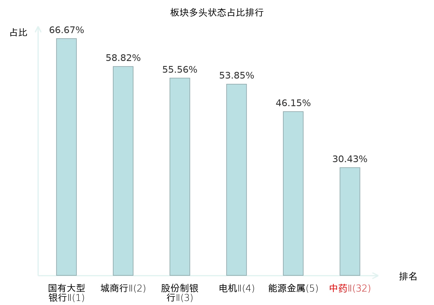 全市场所有行业板块中主力多头状态占比排名中,国有大型银行Ⅱ板块位居第一。自动化设备板块名次提升最快,较昨日上升57位。