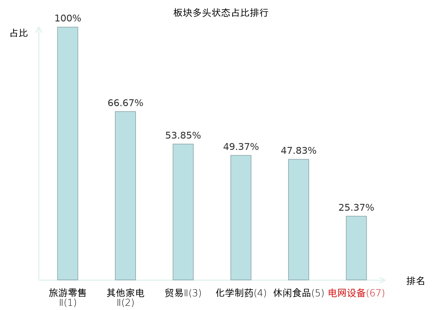 全市场所有行业板块中主力多头状态占比排名中,旅游零售Ⅱ板块位居第一。互联网电商板块名次提升最快,较昨日上升55位。