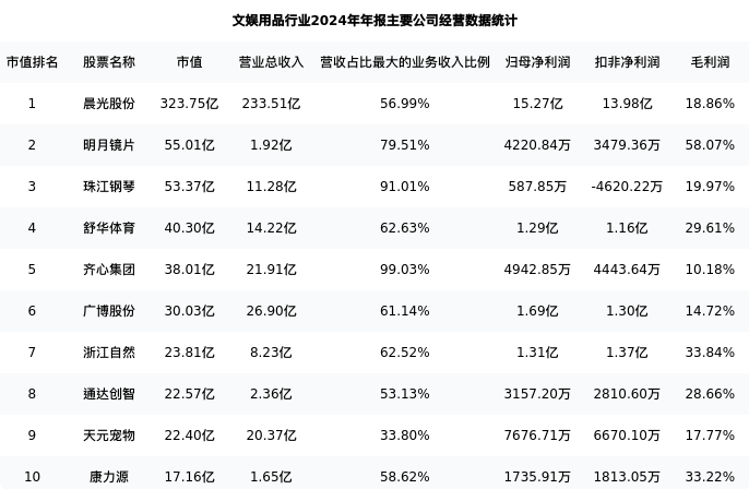 晨光股份最新报告期数据为年报,下表汇总了文娱用品行业内市值靠前的公司年报主要经营数据