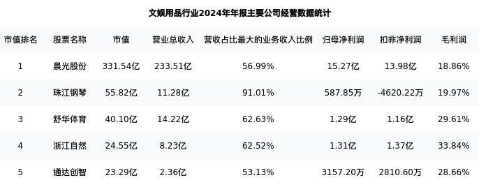 晨光股份最新报告期数据为年报,下表汇总了文娱用品行业内市值靠前的公司年报主要经营数据