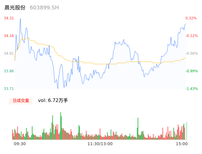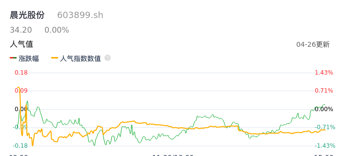 04月26日,晨光股份收报34.20,股价涨幅0.00%,成交金额2.28亿元,换手率0.73%。