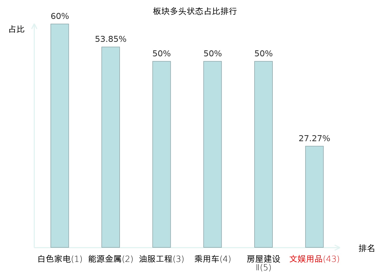 全市场所有行业板块中主力多头状态占比排名中,白色家电板块位居第一。油气开采Ⅱ板块名次提升最快,较昨日上升45位。