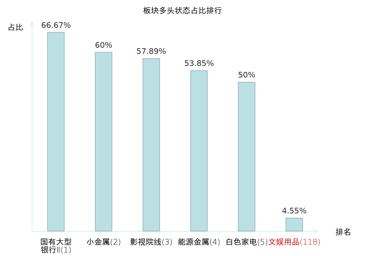 全市场所有行业板块中主力多头状态占比排名中,国有大型银行Ⅱ板块位居第一。装修装饰Ⅱ板块名次提升最快,较昨日上升48位。